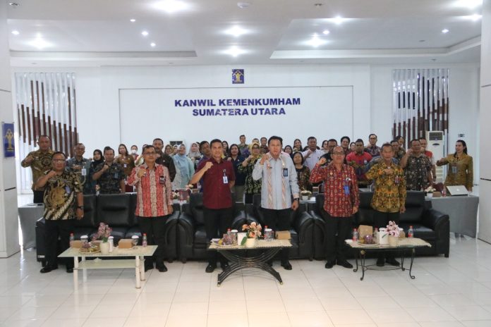Medan-Kantor Wilayah Kementerian Hukum dan HAM Sumatera Utara (Kanwil Kemenkumham Sumut) melaksanakan penguatan pelaksanaan Indeks Reformasi Hukum (IRH) dan IPK IKM pada seluruh jajaran secara hybrid dari Aula Soepomo Kantor Wilayah, Kamis (24/8/2023).