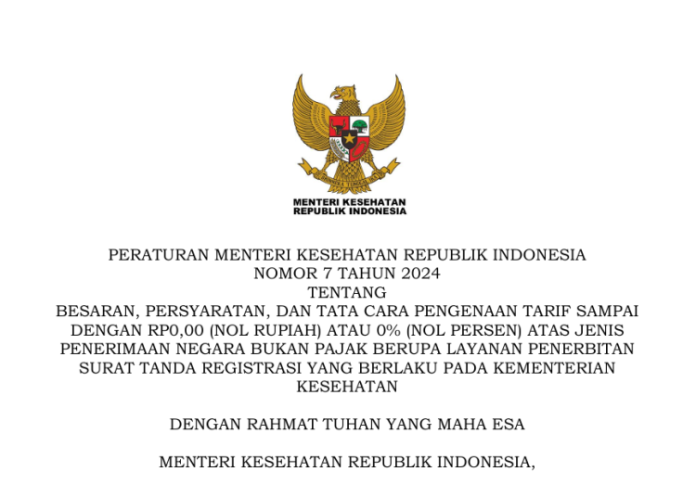 Ketetapan ini disahkan melalui Peraturan Menteri Kesehatan RI Nomor 7 Tahun 2024 tentang Besaran, Persyaratan, dan Tata Cara Pengenaan Tarif Sampai dengan Rp. 0 (Nol Rupiah) atau 0% (Nol Persen) atas Jenis Penerimaan Negara Bukan Pajak Berupa Layanan Penerbitan Surat Tanda Registrasi (STR) yang Berlaku pada Kementerian Kesehatan.